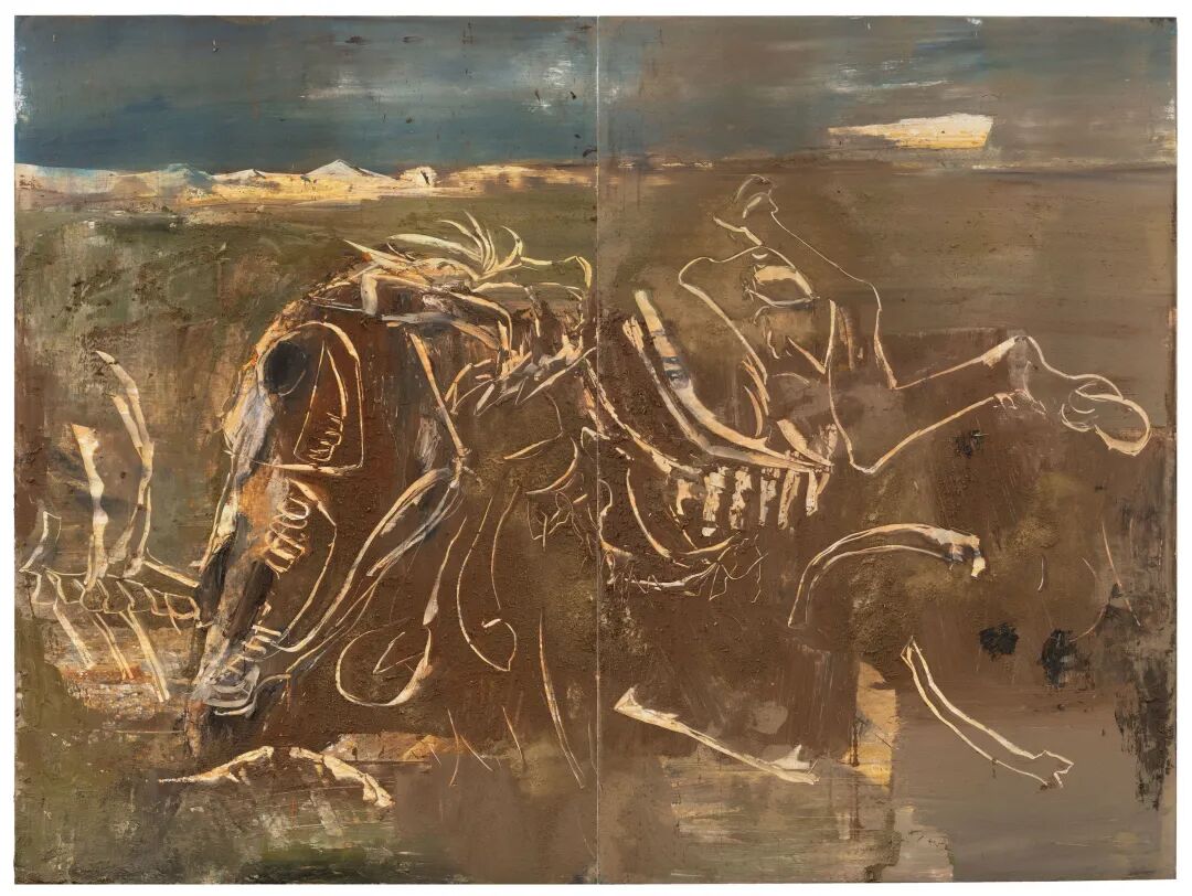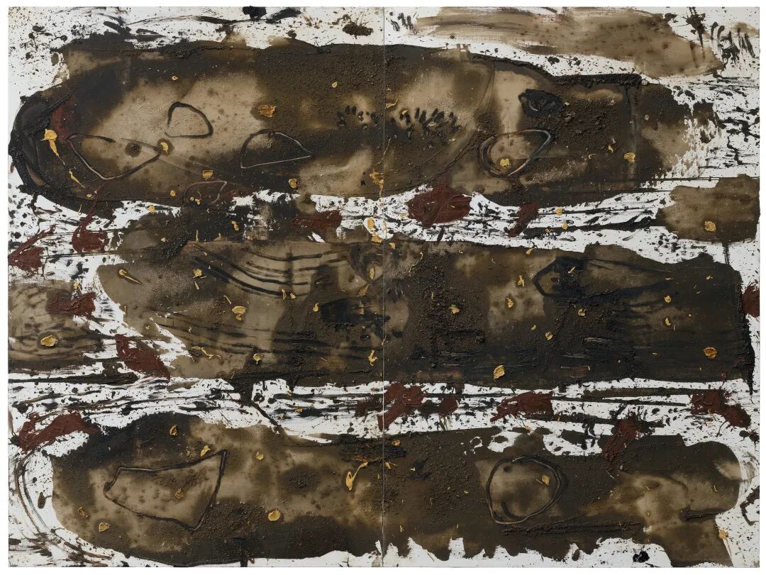 《荒原计划19号》完成于新疆罗布泊,在项目临近结束时,刘商英在最后一幅双联画布上用现场的沙土完成了对原初之地的感知。他最终选择与自然达成和解,风沙不再成为绘画的施暴者,颜色被沙土替代并转变成刘商英绘画的媒介,它们犹如获得了新生,在画面中生长、蔓延。此时,绘画不再关乎描绘,而是在彻底经历了挣扎和内省后的一种自觉,刘商英用绘画穿越了他心中的那片荒原。