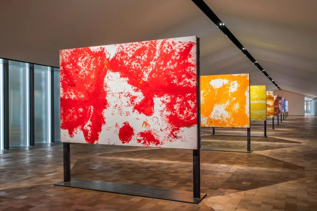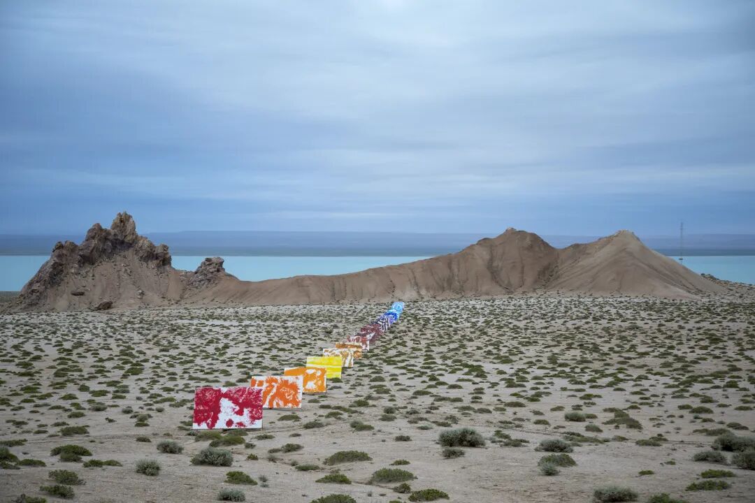 六号展厅以艺术家在这里展出的绘画作品《彩虹》命名,也是整个展览结束前的最后一站。刘商英借用了作品在阿尔金山完成时与现场对话的展示方式,整个系列作品在长五十米的空间中一字延伸开,二十幅单色绘画两幅一组背靠背放置,观众在近距离穿过时也会在尽头两端彼此回望,从而呈现出一种可与之相遇的时空氛围。同时,该展厅也会循环放映刘商英在罗布荒原及阿尔金山的记录影片,以邀请观众一同进入艺术家在世界中的行走。