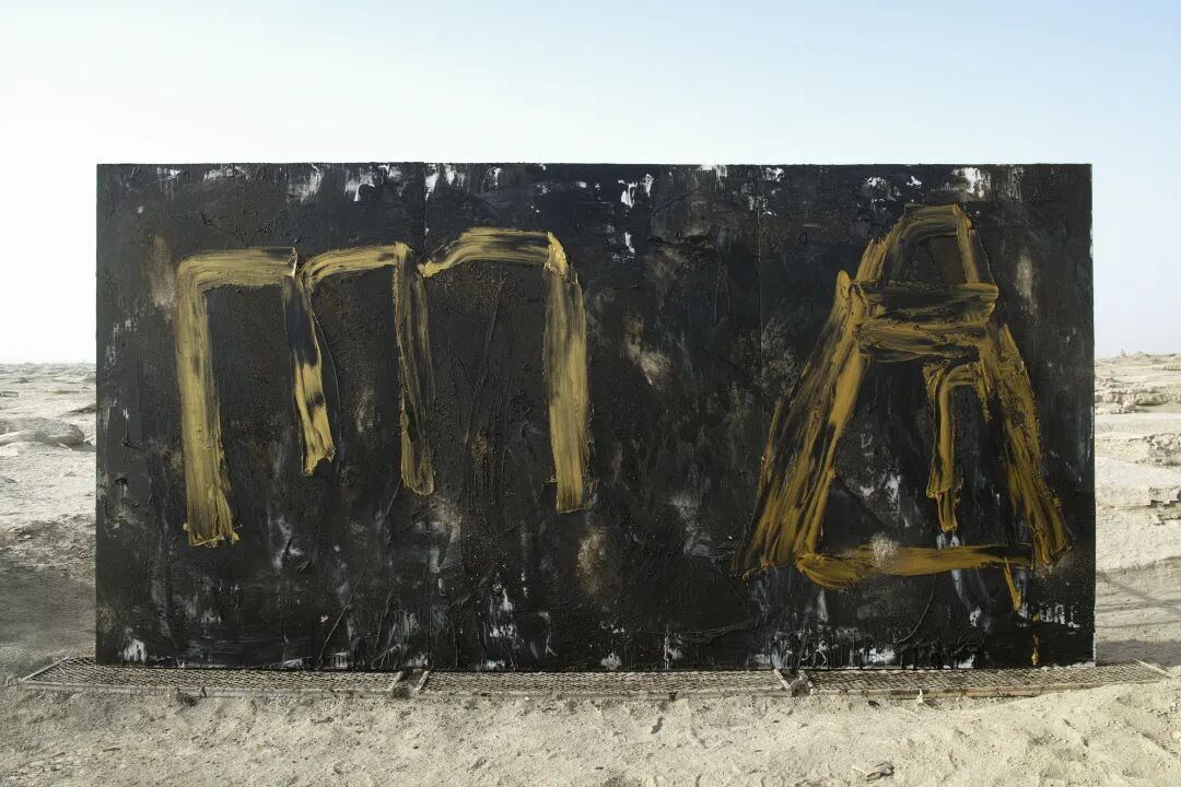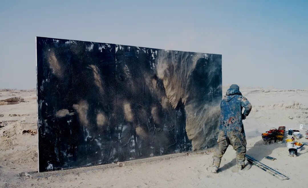 《荒原计划14号》是刘商英“荒原计划”项目中一件转折性作品。面对已成为荒原本身的楼兰遗址,艺术家感受到了人与自然在时空中无法割裂的精神联系。在经历了从被动的抵抗到僵持的拉锯后,刘商英终于决定让自然主动参与绘画。他第一次铲起地上的沙土并泼向等待它已久的黑色画面,伴随沉闷的撞击声,那些砸在画上的沙土炸开了隐匿在艺术家心中的迷雾。
