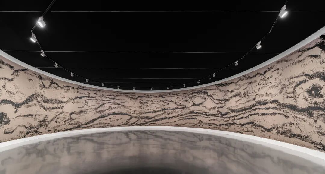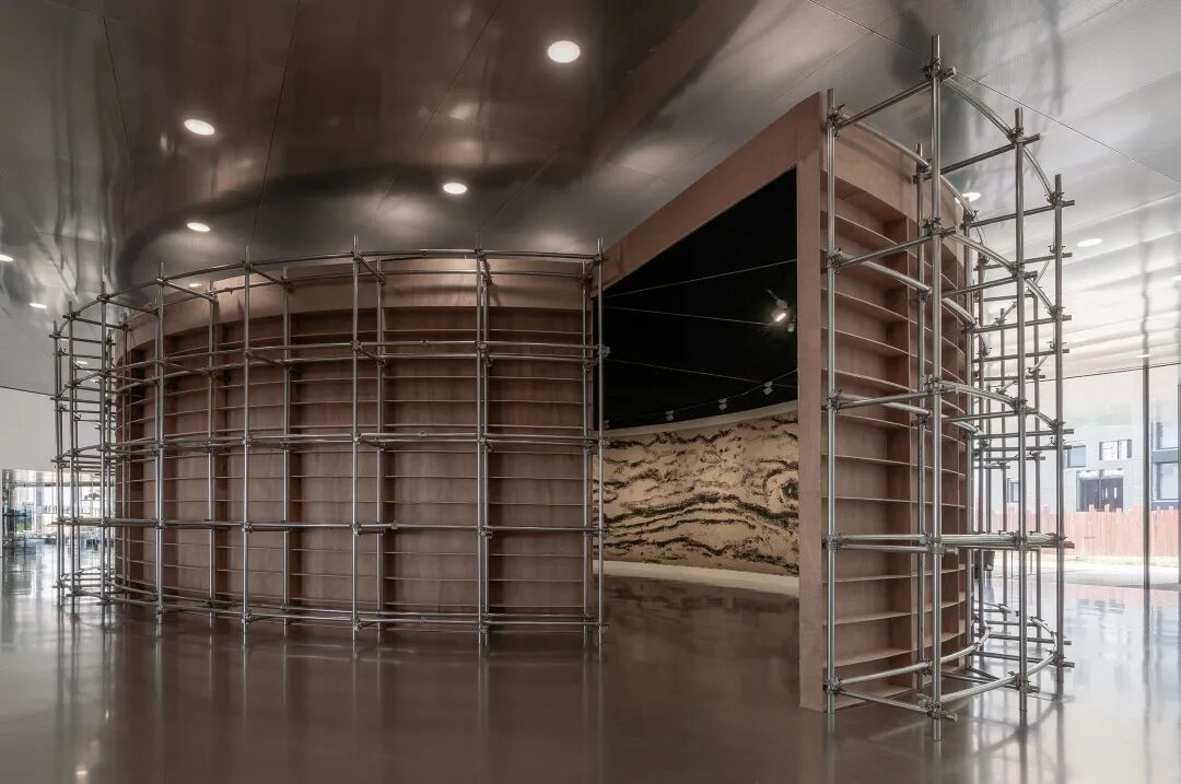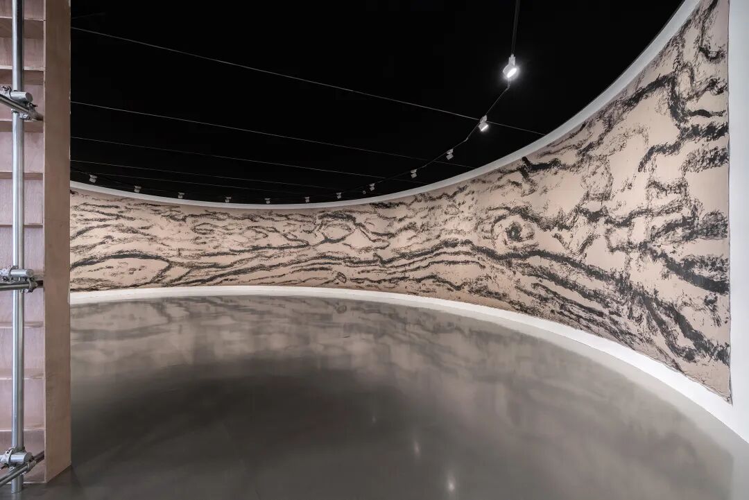 在展览的一号展厅,脚手架和木板打造的环形空间,脚手架和木板是艺术家实现行走计划中的必备之物,而环形空间的建立,模拟了艺术家在罗布荒原的动线,试图创建一个与自然场域同构的绘画场域,令观众在不断地移动中观看这件长达30余米的巨幅作品,也同时感受艺术家在自然中被包裹和覆盖的绘画体验。