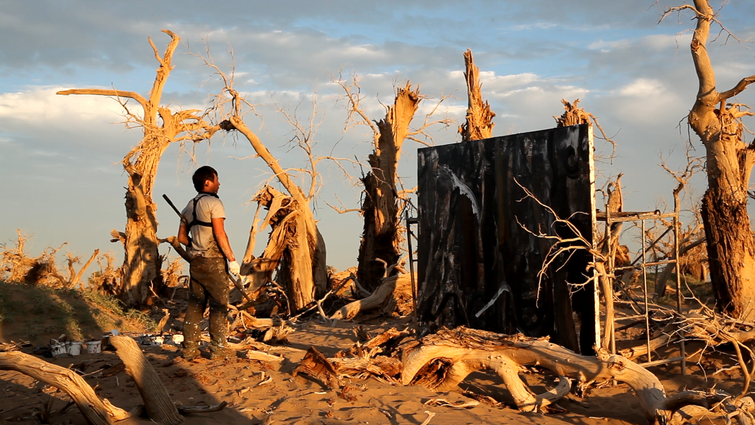 刘商英铲起地上的沙土并泼向画面,让自然主动参与绘画