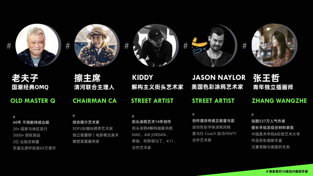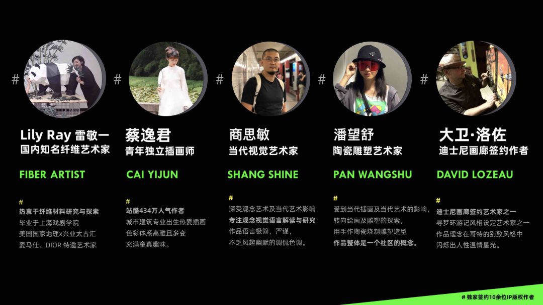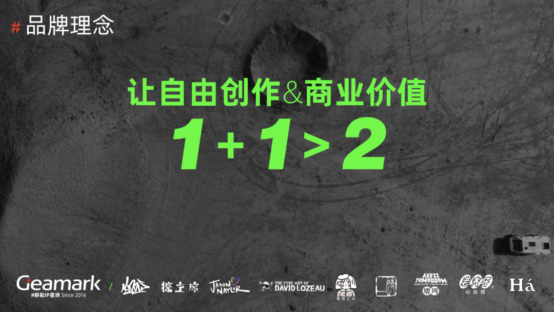 1+1>2的IP运营商业模式更多的是给艺术家/设计师一种新的载体,不消耗他们的原作,帮他们商业化,一起创作出新的作品,辐射到各个领域中。这样就是我们运营的逻辑就是自由创作和商业1+1>2,不是说单纯的做服务。
