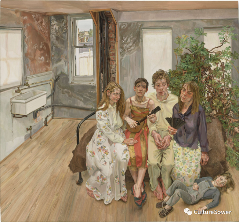 这也是弗洛伊德第一部直接与“历史”画作——让-安托万·沃特托的《皮埃罗》(Pierrot)(约1712年;马德里蒂森-婆罗洲米萨国家博物馆)对话的作品。弗洛伊德将这位法国大师描绘的华丽盛宴转移到了他的工作室内部,用他的个人缪斯、他的爱人和他的后代(两个合法孩子的父亲,西格蒙德·弗洛伊德的孙子显然承认了其他十二个孩子的父亲身份)取代了瓦特多的《喜剧》。事实上,弗洛伊德的大部分作品都有自传的内容。