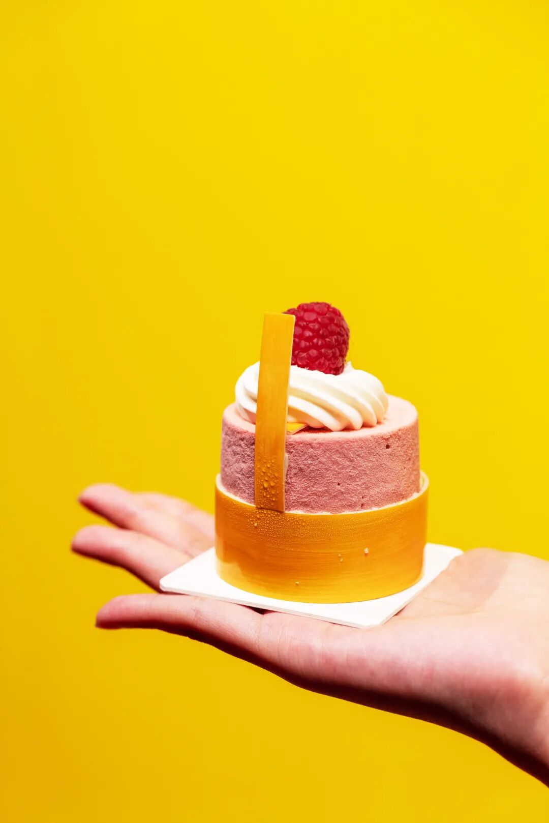 《穿插》作品中极富冲击力的暖色调令甜品创作者高鑫瞬间联想起草莓与树莓——身披红色的温暖外衣、包含着酸甜汁水的果肉在与舌尖碰撞的刹那带来刺激的感受,进而形成难以忘却的感知体验。同时,作品中丰富的几何感在高鑫的手中被立体化,形成了一个个小巧的“塔”。