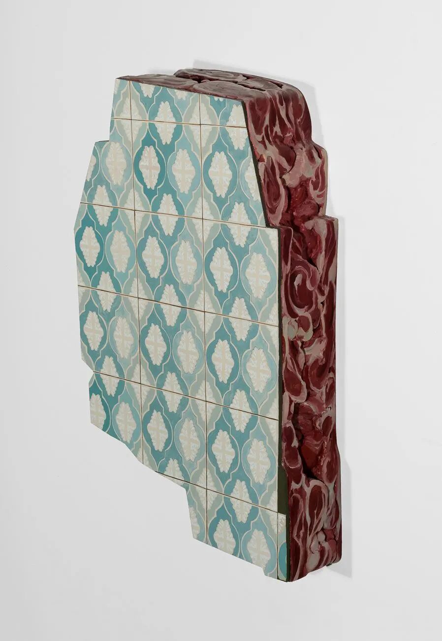 对于 Varejão 来说,巴洛克式的空间戏剧呈现出多种形式:在《Ruina de charque(肉类废墟)》,她于 1999 年开始创作的一系列大型独立雕塑,Varejão 模拟了瓷砖建筑碎片,与彩绘的内脏一起翻腾。这些作品的字幕中引用的特定位置表明,熟悉的空间被过去和现在的暴力幽灵所困扰。
