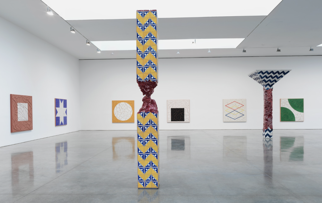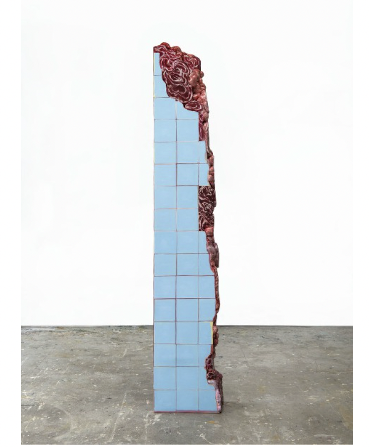在展览中,三个全新的《Meat Ruins (2020–21)》在展览空间的中心,其他画作围绕着它们,高耸的柱子模拟了塔拉维拉瓷砖墙壁和建筑元素的碎片。