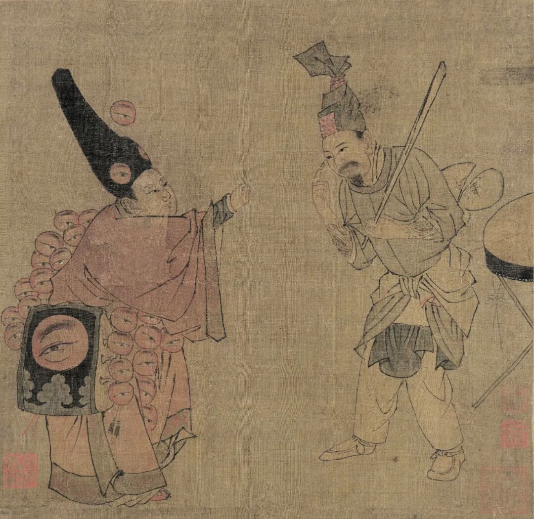 宋人杂剧的《眼药酸图》亦令人有会心的微笑。“眼药酸”是南宋的一部杂剧名字。杂剧名中加“酸”字多是以仕途无望的落魄书生为嘲弄对象,这里指卖眼药的推销员。这幅画是为了当时的同名杂剧所做,是一幅“宣传海报”。