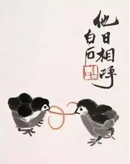 他有一幅《小鸡争蚯蚓图》,名闻世界,到处都见它在做贺年片用,画两只雏鸡在争夺一条蚯蚓。由于齐老在上面自题“他日相呼”四字,所以亦有人名之曰《他日相呼图》。