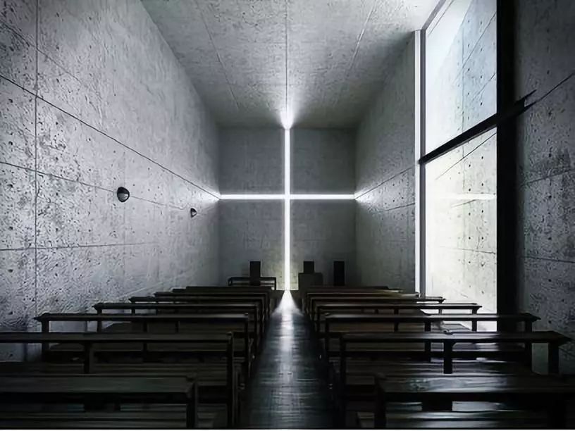 光的教堂表现的是光这种自然元素的建筑化和抽象化。空间几乎完全被坚实的混凝土墙所围合。内部是真正的黑暗。在那样的黑暗中飘浮着一道十字架的光线,这就是全部。墙上的裂 赋与空间以张力并使之神化,它们抽象地渲染着已经建筑化了的室外光线。
