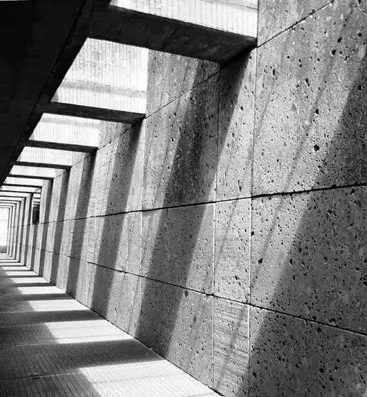 康对于光线的精妙应用主要体现在他的“双层墙(double-Sheller)理论”上。此理论中,建筑的开口成为“光的过滤器(( tight fliters)”。每扇窗的外面都有一面独立于窗前的薄墙,上面开足够大的洞口来接纳光线的进入,既调节了投射入空间的光线质量,又不至于遮挡人们的视野,并且使光线的自由调节成为可能。