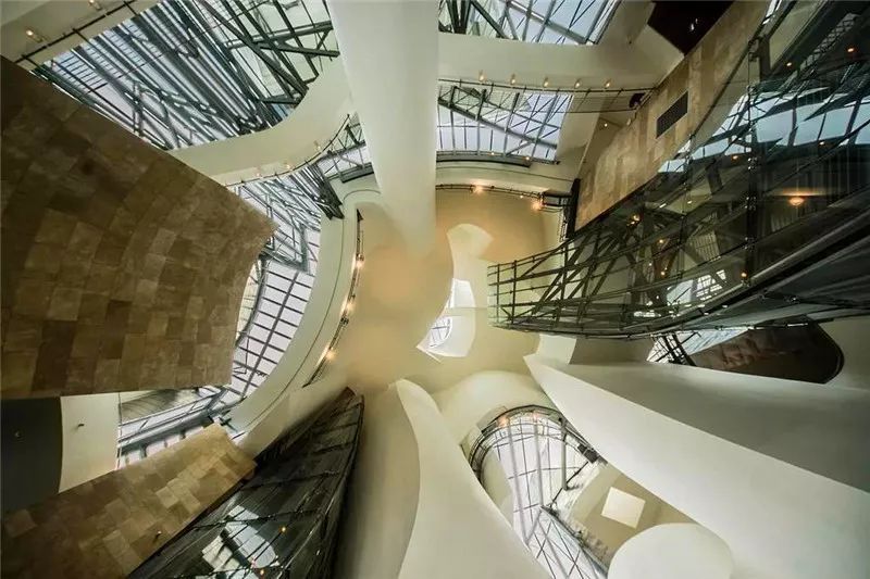 中庭是整个建筑的中心,盖里称为“将帽子扔向空中的一声欢呼”所有的零散体块最后都汇集于此,中庭内楼梯、电梯的外表被包装成平面、折面、曲面。透明与不透明的饰面材料在这里交替使用,形成虚虚实实的现代雕塑的效果。内部空间丰富的层次使室内光线如同幻境一般。盖里很善于利用不同体块间形成的缝隙作为天光的采光口,形成温和却形态各异的光线。