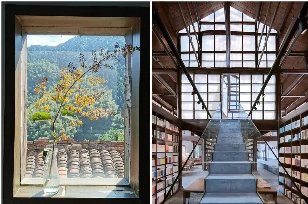先锋书店是集图书馆、书店、咖啡馆等多种功能于一身的综合休闲体验空间。书店入口处就是一个宽阔的走廊,一侧是整齐排列的书架,另一侧则是一个大型的玻璃窗,在视觉上拓宽了书店的宽度。里面还特意开辟了一个观景平台,可以浏览村落中的山川风光,近在咫尺的山峦云海,给人以赏心悦目的享受。