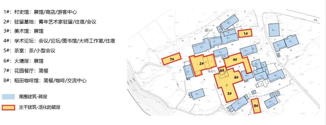 于是设计师采用新旧结合可持续发展的策略,在村落结构中区分主干建筑和周围建筑,汇总形成共生、共建、原生、动态的村落格局。“通过空间更新,我们想将破败的房屋改造为公共空间,希望再造一个‘中心’,将塌陷的伦理结构给顶起来。”为了达到这个目的,艺术家们不仅改造了7栋破败的房屋,还在院落空坝搭建了露天剧场,在闲置宅基地建造了可以观赏稻田的咖啡厅,将它们活化为公共生活和艺术生活平台。