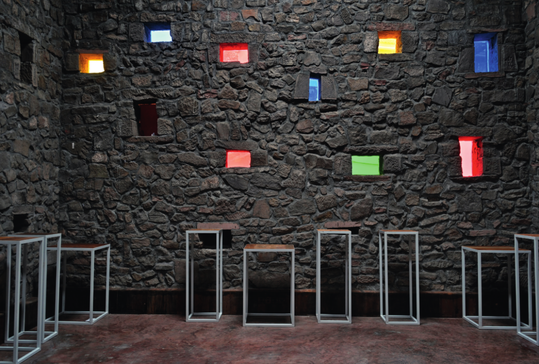 在莲花穴的艺术空间里,有一栋“返璞归真”的火塘屋,是用方圆一公里内收集的条石建成的。与周围的木质结构建筑相比,火塘屋有些与众不同,却又十分协调。这间火塘屋有个独特的设计:墙上镶嵌着彩色的玻璃小窗,光线透窗而入,屋里立刻多了股梦幻的味道。“这跟日常稍微有点距离,但又是日常中不可缺少的。”设计师说道,乡村现场里的当代艺术不是教化,而是共同生长。如果村民天天在这样的环境里生活,他们会有记忆和感受,也会自带艺术和美的模样。