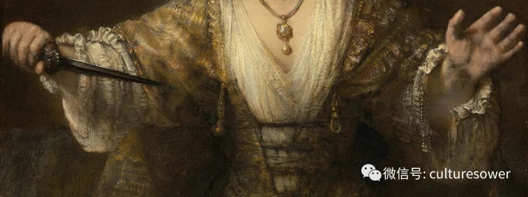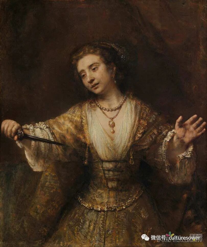 维米尔(Jan Vermeer)在《绘画的艺术》(The Art of Painting)等作品中努力地再现我们所见的世界不同,伦勃朗似乎想用颜料来掩盖这个世界,以便将我们的注意力从绘画的呈现对象转移到绘画本身。让我们观察一下现存于明尼阿波里斯市(Minneapolis)的伦勃朗晚期作品《卢克蕾西娅》(Lucretia)(图1.10)。伦勃朗用饱满的笔触和黄白相间的颜料组合绘制了袍子黄褐色的袖口,袖口中伸出的那只手见证了卢克蕾西娅的自杀。