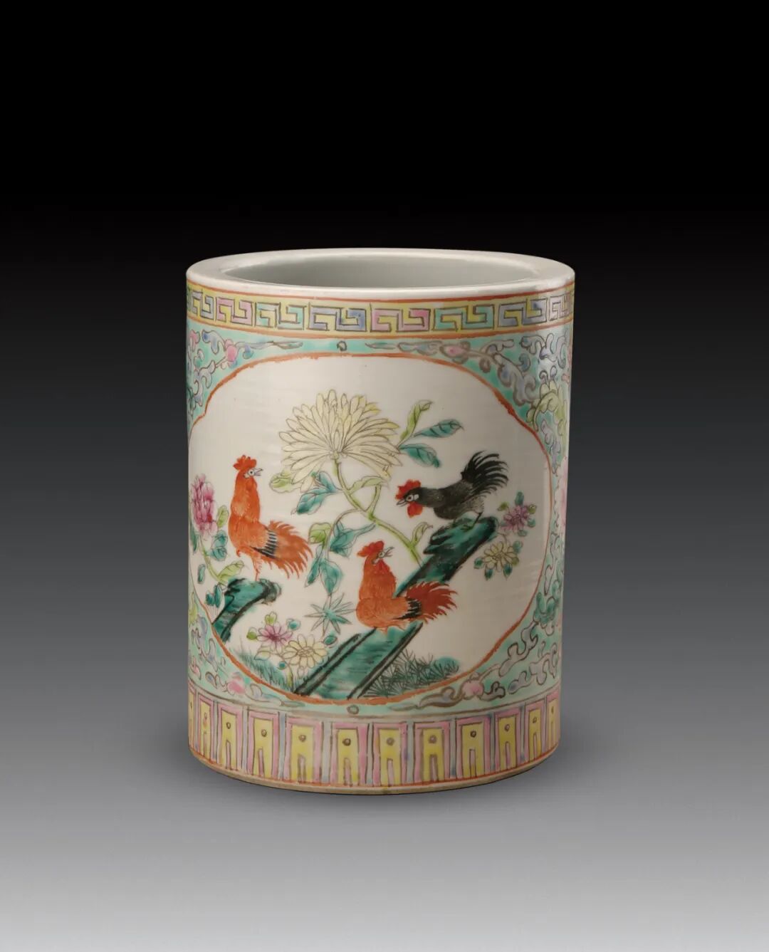 Lot 12 民国 粉彩开光公鸡文笔筒