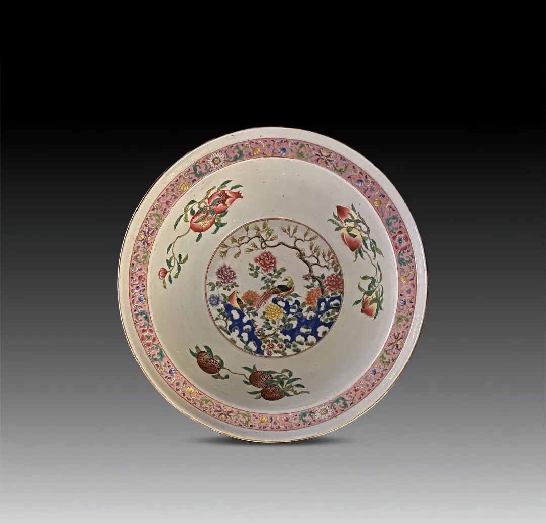 此盆侈口,折沿,斜收腹,瓷质洁白精美,粉润柔和,秀丽雅致,造型精巧玲珑,胎体轻薄,釉面莹洁细润,敷彩新嫩,盆内绘牡丹,石榴花鸟等纹饰,寓意美好,是一件难得的佳作。细节介绍盆心绘凤凰穿牡丹和一株玉兰花,两只凤凰回首相望,牡丹花鲜艳热烈,富丽堂皇,盆心与内壁之间的中圈,绘寿桃和石榴,民谚中有“榴开百子福,献千年寿。”之说,口沿内壁绘缠枝莲纹。