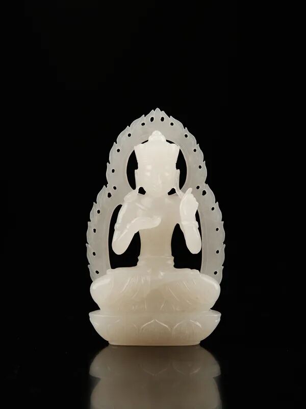和田籽料暖白细腻,玉质柔和,油性十足。整器庄严大气,刀法流利而精湛,极富表现力。大日如来开脸饱满,法相端严,神态温和,形态雍容,佛光普照。五官刻画细腻,弯眉长目,大耳垂肩,身上服饰线条流畅,气质端庄祥和。