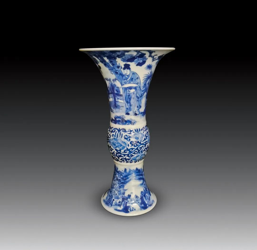 花觚敞口外撇,长颈,中腹微鼓,底露圈足,釉色白而微青。青花蓝正,用笔纯熟,三层纹饰的组合富有创意。底部落“大清乾隆年制”六字篆书款。细节介绍外壁以青料绘制三层纹饰,分别体现出清代三个不同时期的风格特征,颈部绘西厢记仕女图,为康熙时期风格,腹绘缠枝纹,为雍正时期最受欢迎的风格,圈足上绘乾隆时期常见的渔樵耕读图。