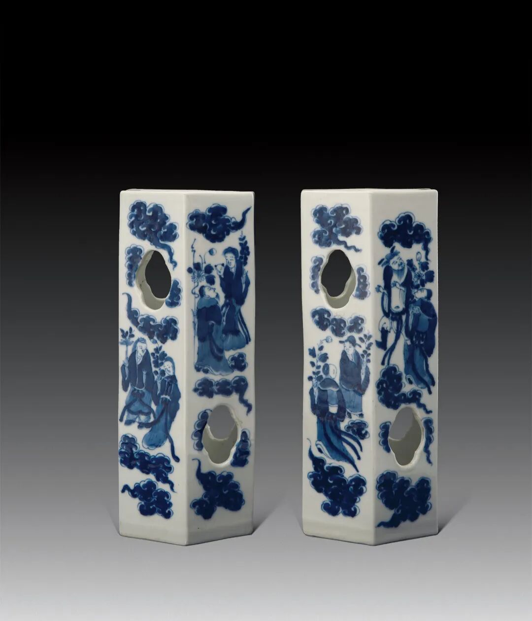 “帽筒”又称“官帽筒”,大约出现在清嘉庆年间,最早为清代官员用于放置顶戴花翎的器具。兼具实用性和观赏性,后多成为居家摆设、搁置小画轴等的器物、女儿出嫁时的必备品。此对青花镂空帽筒,呈六棱柱状,满工青花,镂空,平底。筒身绘如意云纹,布局得当。筒壁每面一个海棠式镂孔,相邻两面镂孔上下交错出现,并饰配两朵云纹,精致可爱。筒壁绘有不同人物手持各类鲜花图,人物神态愉悦,衣裙飘逸,生动自然。