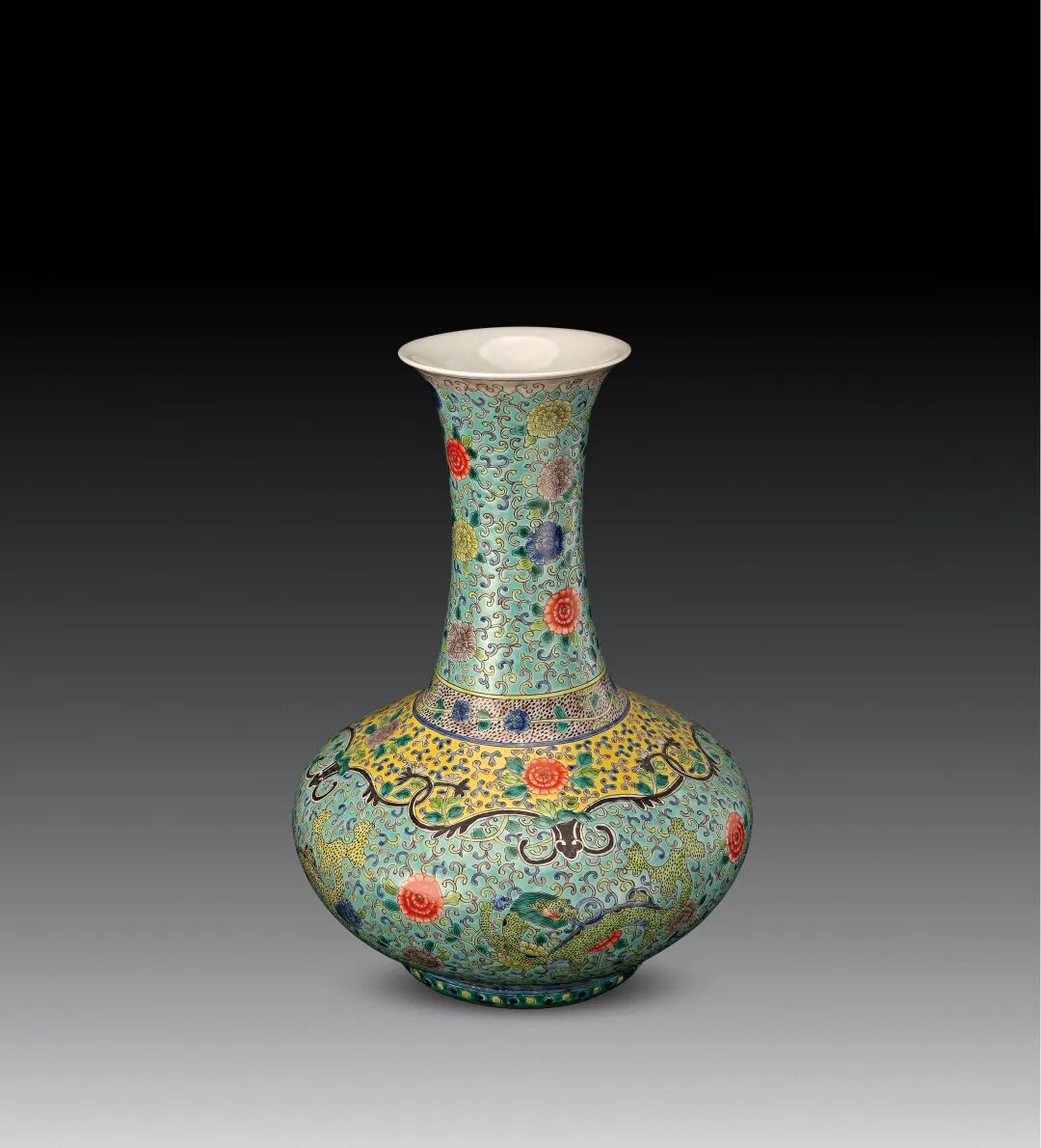 荸荠瓶为清代流行的一种瓶式,粗长颈,扁圆腹,状如荸荠而名。这件粉彩轧道葧荠瓶,撇口,扁圆腹,圈足,器形规正,削足考究,足端露胎,胎质洁白细腻。用轧道工艺,通身装饰粉彩缠枝花卉纹,色彩鲜艳,瑰丽,晶莹,玉润。工艺材质介绍粉彩瓷是珐琅彩之外,清宫廷又一创烧的彩瓷。在烧好的胎釉上施含砷物的粉底,涂上颜料后用笔洗开,由于砷的乳蚀作用颜色产生粉化效果。粉彩简单率直,浓笔艳抹,富贵豪华而别具一格。