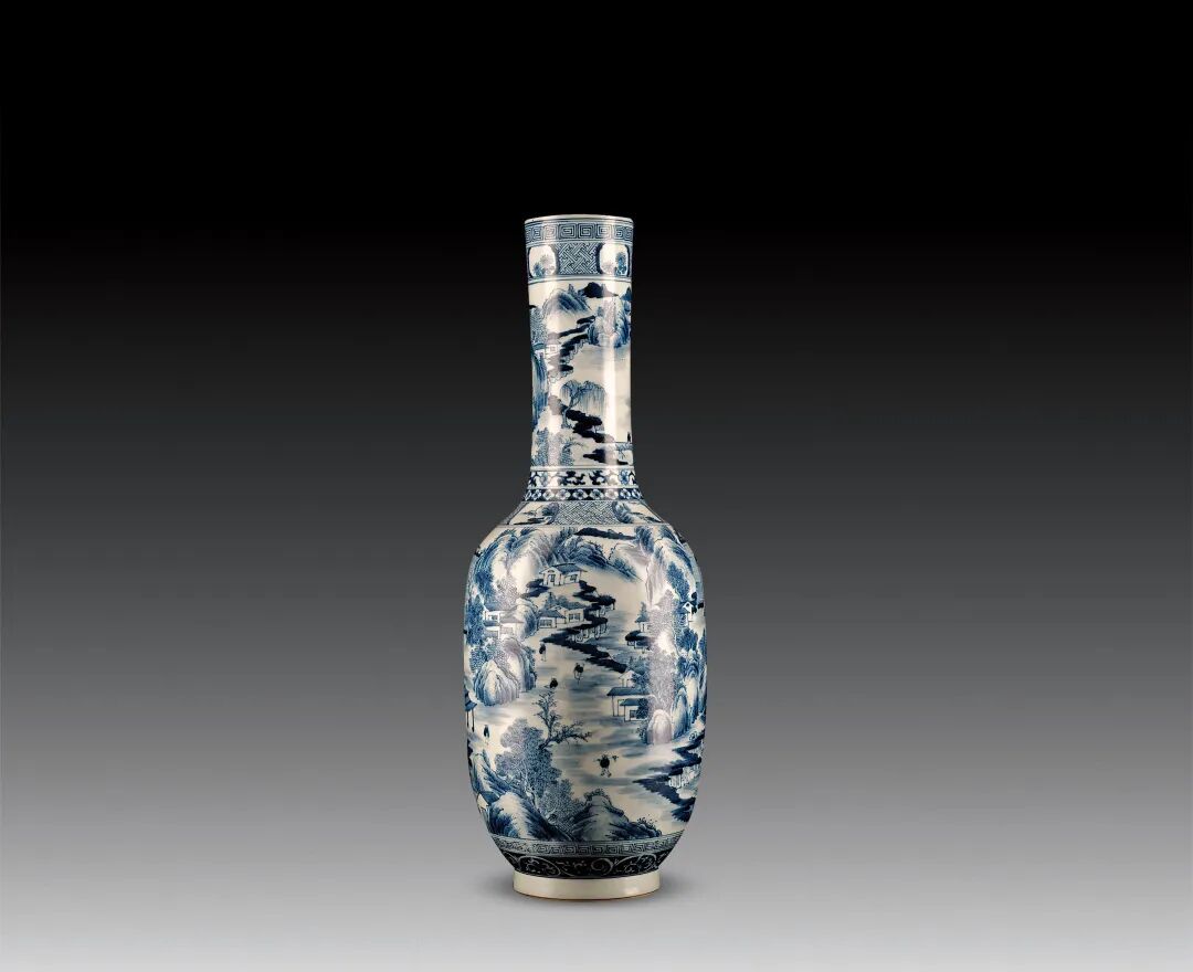 这件青花山水纹长颈瓶,直口,细长颈,溜肩,弧腹,圈足,通身绘青花山水纹,整体画面高低、远近布局合理,犹如一副中国传统山水水墨画,墨色淡雅,用笔简练,意境深远。底部满釉,修足规整, 无底价款识。细节介绍亭台楼阁、山石草木、嶙峋怪石、树木人物,颇具质感,状物有神。宛如世外桃源。