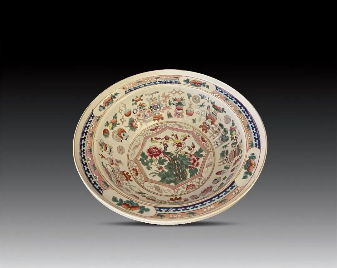此盆侈口,折沿,斜收腹,在柔和莹润的白釉上绘制多宝花卉,色彩搭配协调,构图饱满,元素繁而不乱,极富观赏价值。细节介绍盆心为牡丹孔雀纹,色彩鲜艳油绿,生机盎然,纹饰线条流畅,构图舒朗,寓意富贵吉祥,盆壁绘制各种各样的珍玩、蔬果等吉祥物件。