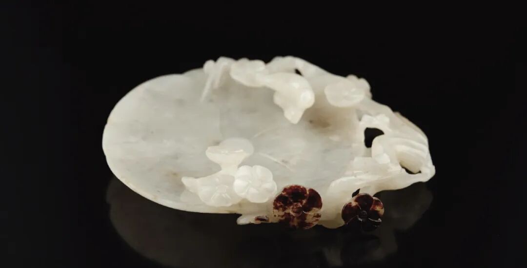 此器取荷叶为形、玉质温润,油润度极好,包浆醇厚,叶片上施以镂空浮雕技法,喜上眉梢题材,寓意极好,整体造型鲜活;工、料、意、趣等皆属上乘,乃文人墨客文房精品。