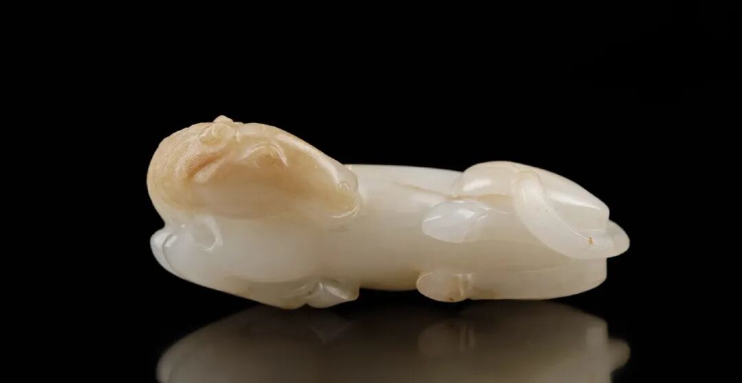 此件卧马籽料白玉质,圆雕而成,局部黄褐色沁,天然斑斓。整器玉质润泽,加之沁色的点缀,更显古朴可人。马为菱形眼,口唇紧闭,神情温和宁静。马鬃细密覆于颈背,刻画得柔和整齐,马尾修长垂下,四肢健壮蜷于身侧,栩栩如生 . 人们常用“马到成功”来祝福事业能顺利取得成功。