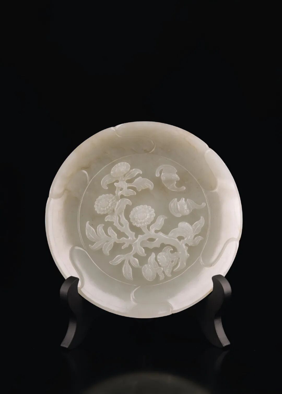 此件玉盘品相完美,典雅雅高贵,局部带沁,雕刻福寿纹,寓意美好,雕工超群,韵味十足,玉质细腻,皮壳包浆醇厚。