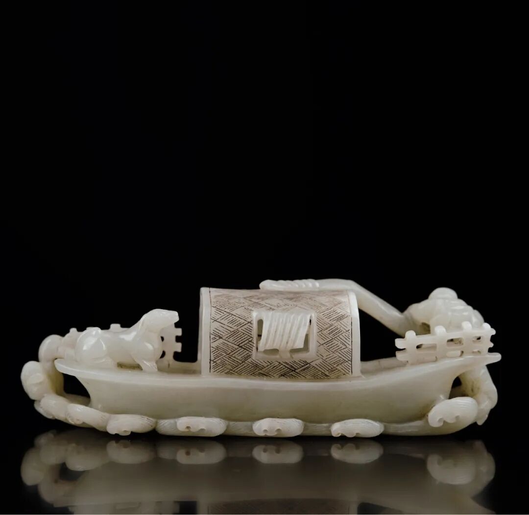 Lot 143 明代 和田玉雕渔夫与狗船舶摆件
