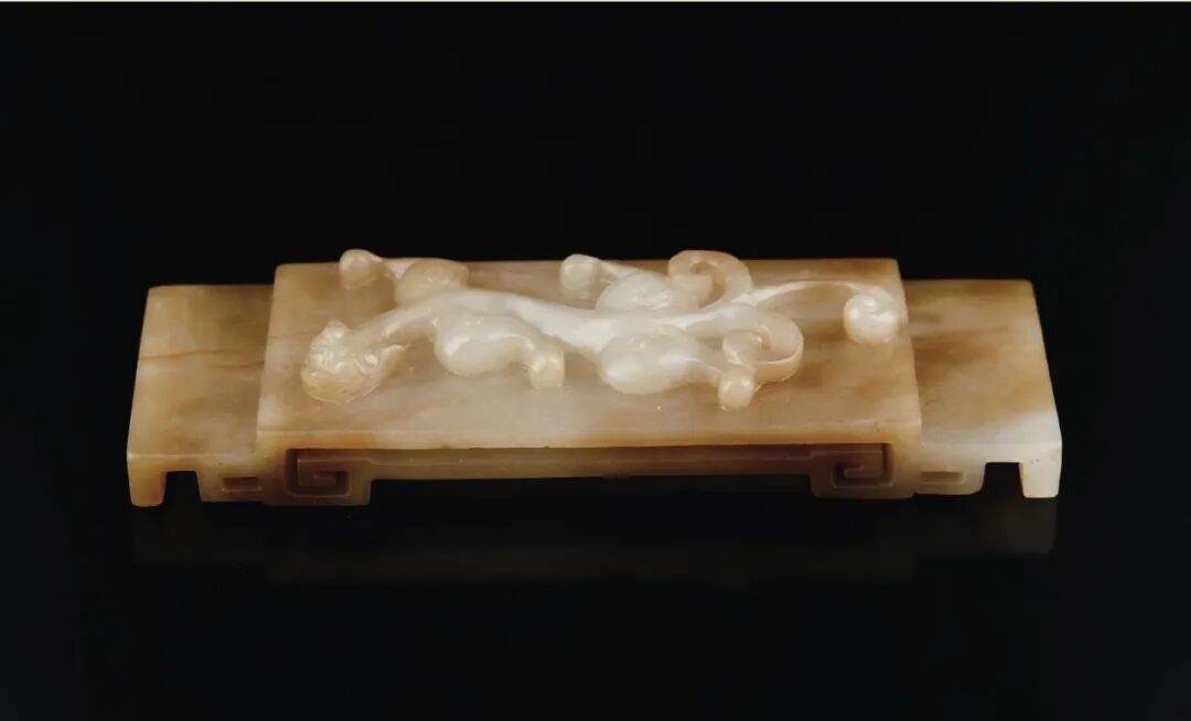 墨床,专门用来放置墨锭的,是文房中小件物品,具有观赏意味。此墨床温润,造型棱角分明、大方简洁。置墨之时,玉、墨两相映衬,愈显清爽莹润。此墨床和田籽料玉质,表皮带淡黄色沁,包浆温润,古意盎然。墨床呈长方形,两侧稍低。通体莹润,正面雕刻螭龙纹,螭龙造型威猛生动,毛发飘逸,古雅别致,工艺精湛。
