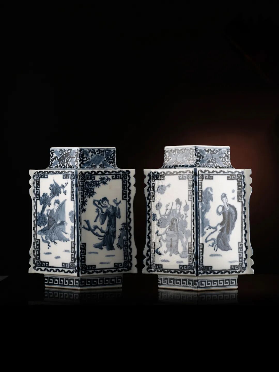 Lot 80 清代 青花开光人物纹菱形四角瓶一对