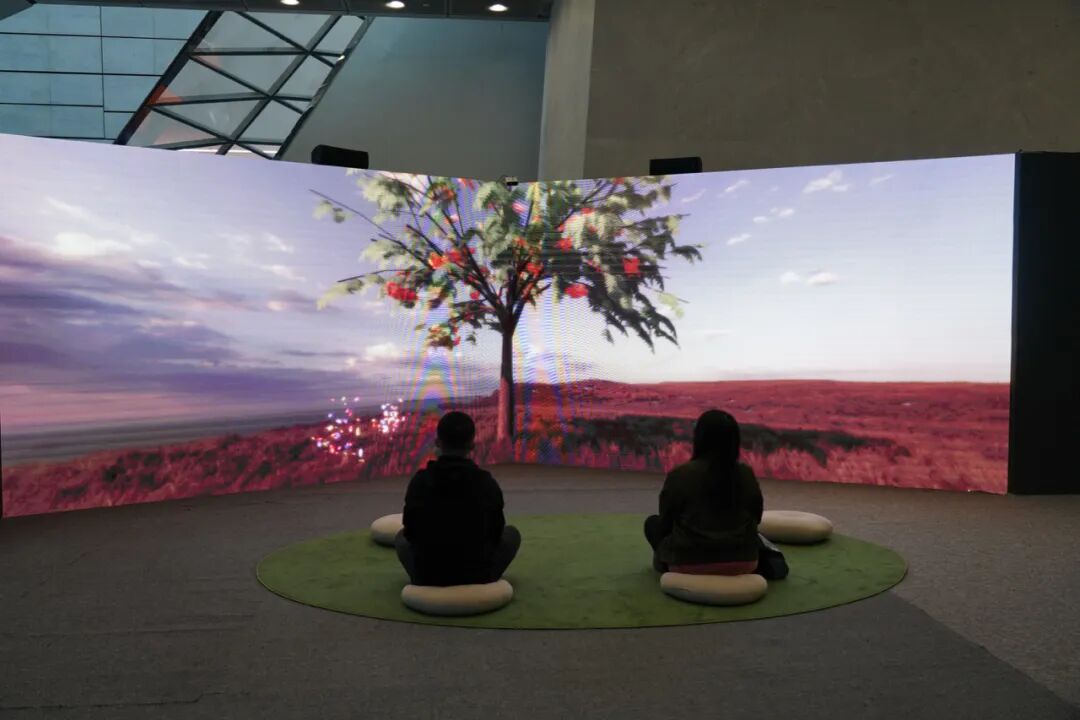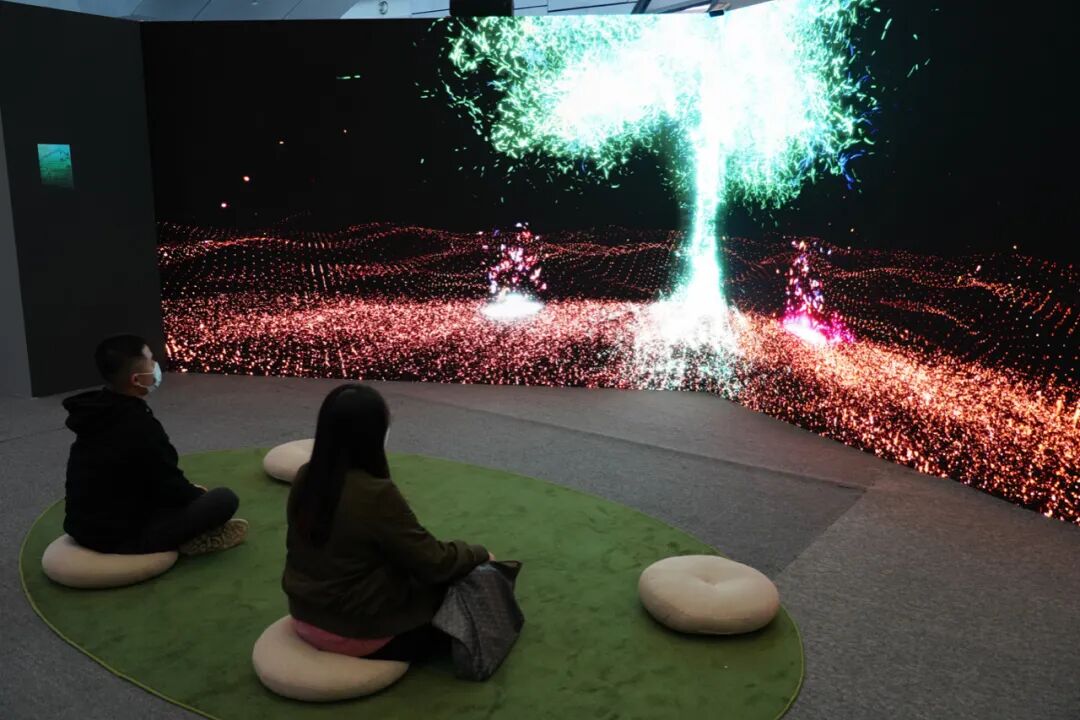 作品介绍:作品模拟寸草不生的未来中一个虚拟丛林。植物的数码档案是用来缅怀大自然的工具。作品模拟自然环境,保存大自然的资料,为观众提供休息与沉思的空间,观察树木及周遭环境的生长更替。通过虚拟大自然,作品寻求观众的自我接纳,从而延伸到对万事万物的欣赏、尊重和包容。作品透过与观众的互动,呈现不同物种在大自然和平共处的景象,观众的一举一动会影响各种植物的生长周期。随着观众静止或不移动,森林会新培育出丰富且多样的物种,或呈现另一种状态。在这个虚拟画布上和之外,艺术家邀请观众创造和体验他们自己的天堂。