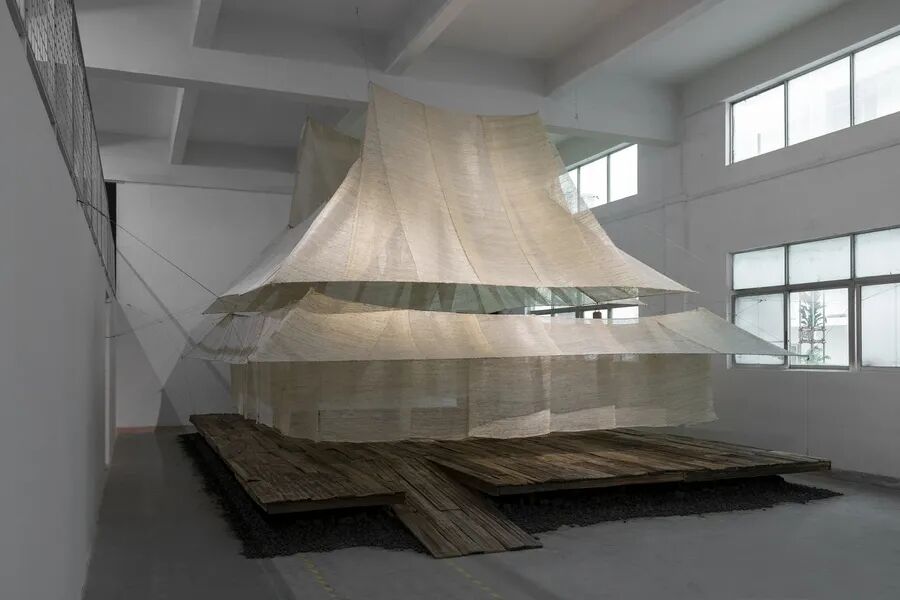 《布屋》,杨雄(筑象建筑、昆明当代美术馆)(昆明),创作执行团队:杨雄、罗西尧、杨梦娅,建筑装置(手工纺织葛布,回收藏房铁杉闪片瓦,云南腾冲火山浮石,钢索),2022