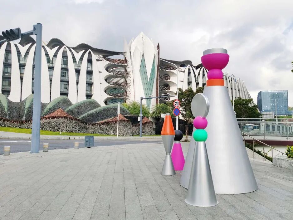 浪静路作为时尚小镇重要干道,道路一侧是现代时尚产业园和服装商城,另一侧则有大片面积封闭闲置的原石凹第二工业园区及原员工宿舍楼,是为不在服装产业链条上的厂房空间,两侧景观相对割裂。此次双年展希望打破小镇不同空间的壁垒,在拆除展场围墙之外,将数件公共装置作品散落至展场入口小巷中及展场附近的浪静路上。作品与工业厂房、产业园区共存,是一次缝合街巷空间,为小镇带来更多活力的尝试。