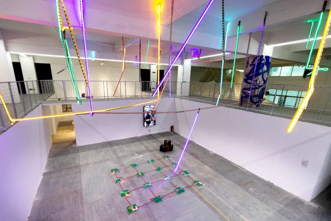 《连线》,王友身,装置(原厂遗留吊线、龙骨、钢架等,LED灯,视频),2022