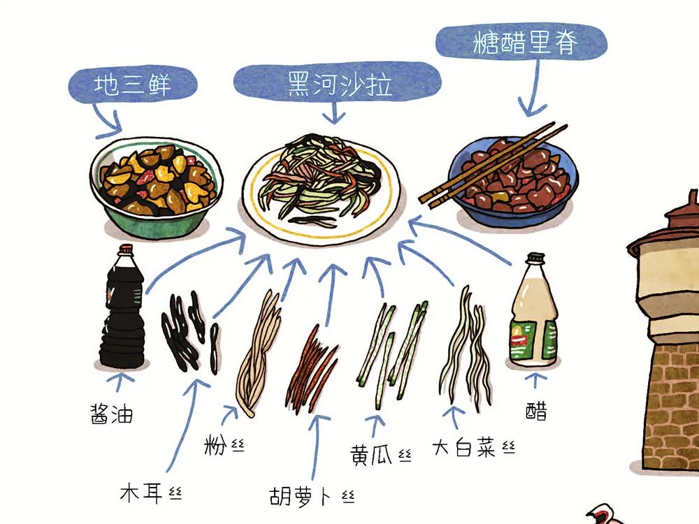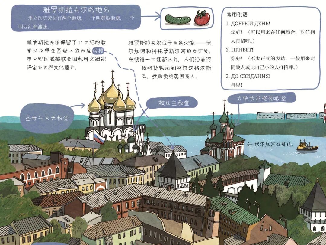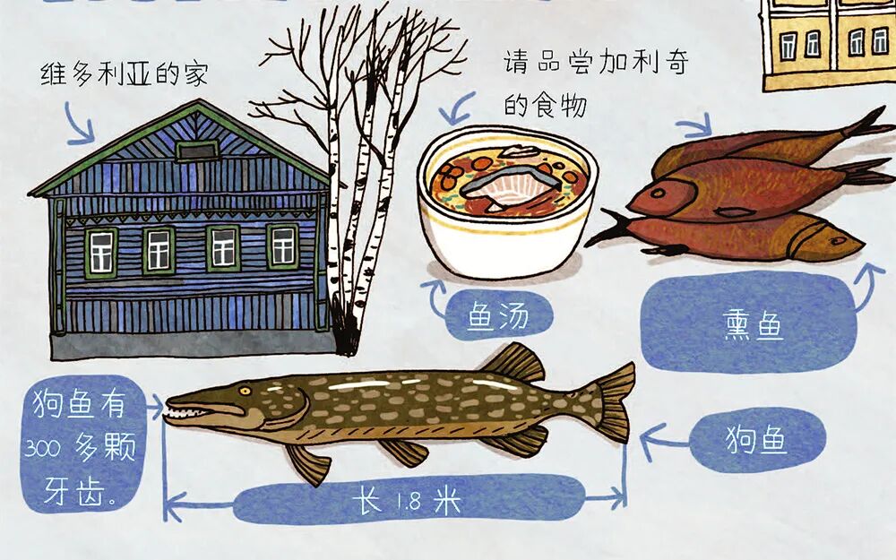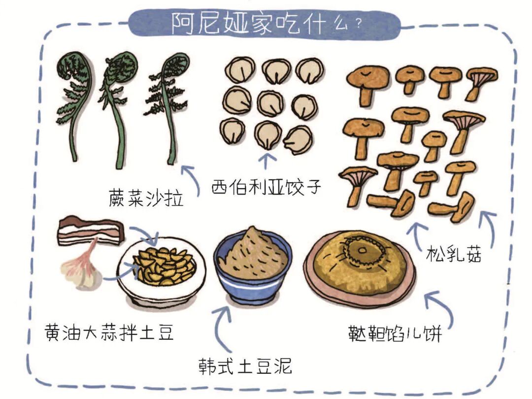 除了大量各式各样的建筑,翻开绘本,还能看到俄罗斯各地美食。俄罗斯人对土豆的喜爱世界闻名,有些吃法我们可能都第一次听说。