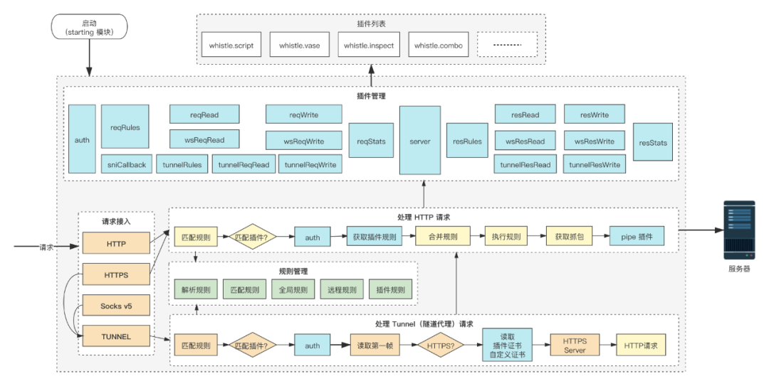 Whistle是使用npm包pfork来启动插件进程,进程间的交换是直接通过Node的http模块实现的),方便开发者利用http的生态开发插件。