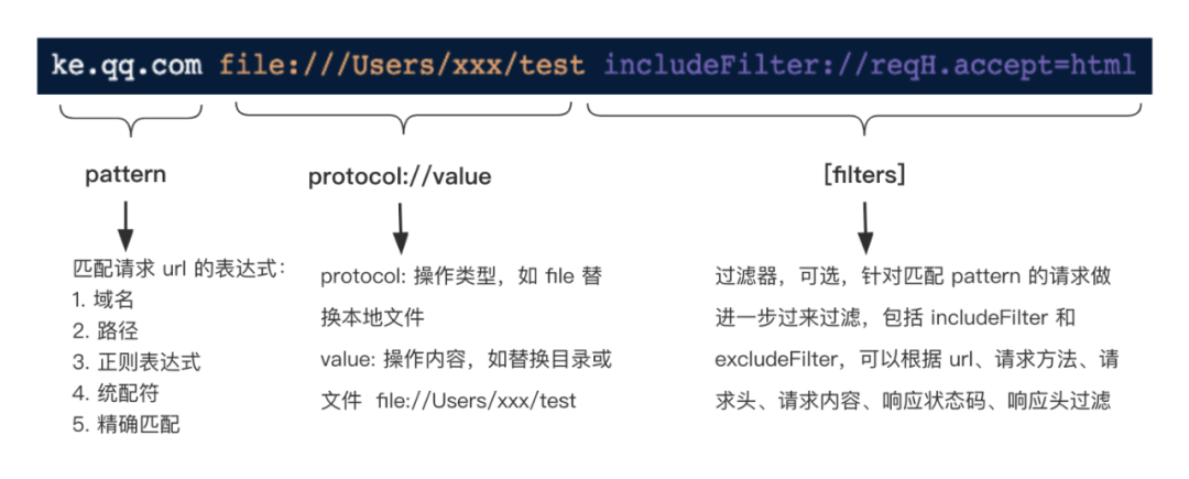 插件规则(私有规则),即进入插件的请求(匹配的全局规则里有whistle.xxx协议)才会匹配到的规则,由以下规则组成:
