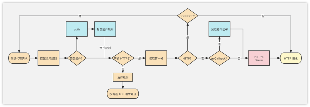 通过匹配的全局规则判断是否要解析隧道代理请求,如果不解析,则当成普通TCP请求处理;