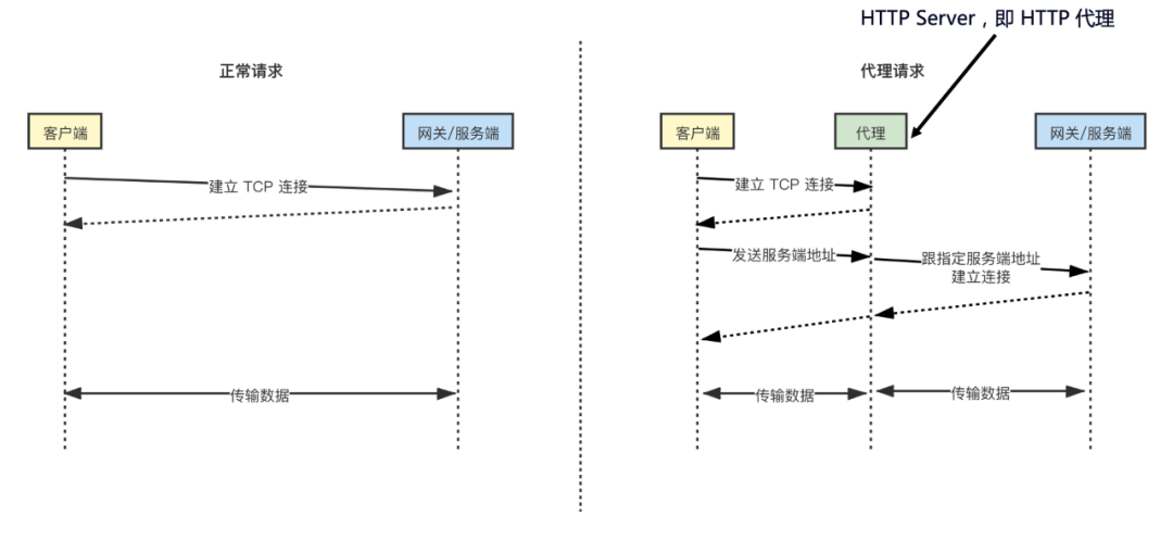 经过代理的请求:客户端不与服务端直接建立连接,而是先跟代理建立连接后,将目标服务器的地址发送给代理,通过代理再跟服务端建立连接,这里如果代理服务为HTTP Server,则称为HTTP代理。