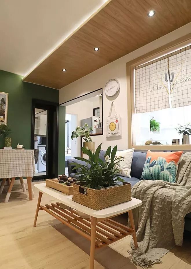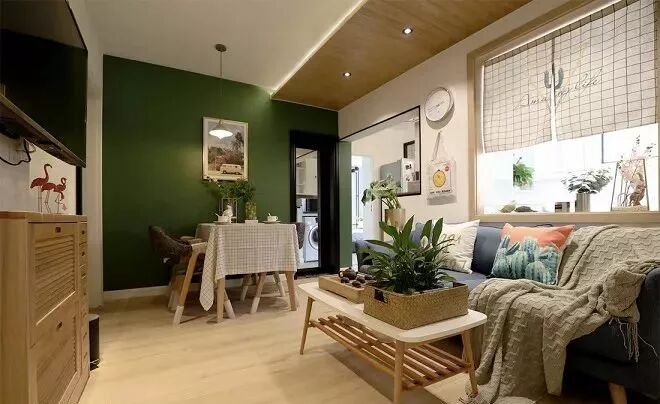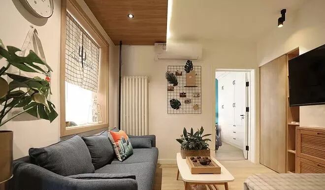 将客厅凹陷部分做储物空间,墙面化零为整作为新的电视背景墙。木色和白色是最佳CP,就像沐浴春风,说不出的惬意和温暖。因为层高太矮的缘故,设计师在沙发空间顶部做了局部生态板吊顶,不仅使整个空间更有层次,还平添了一份时尚自然的风景。