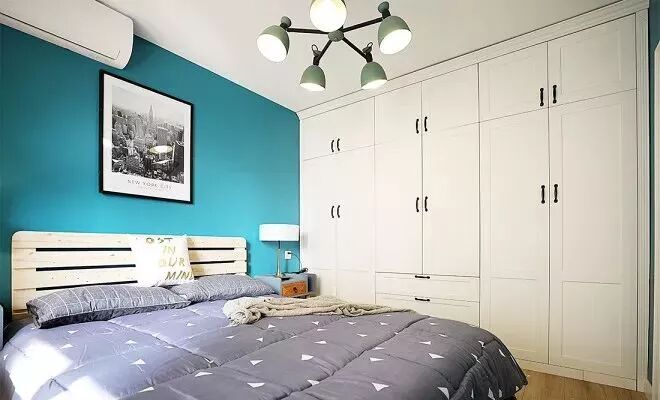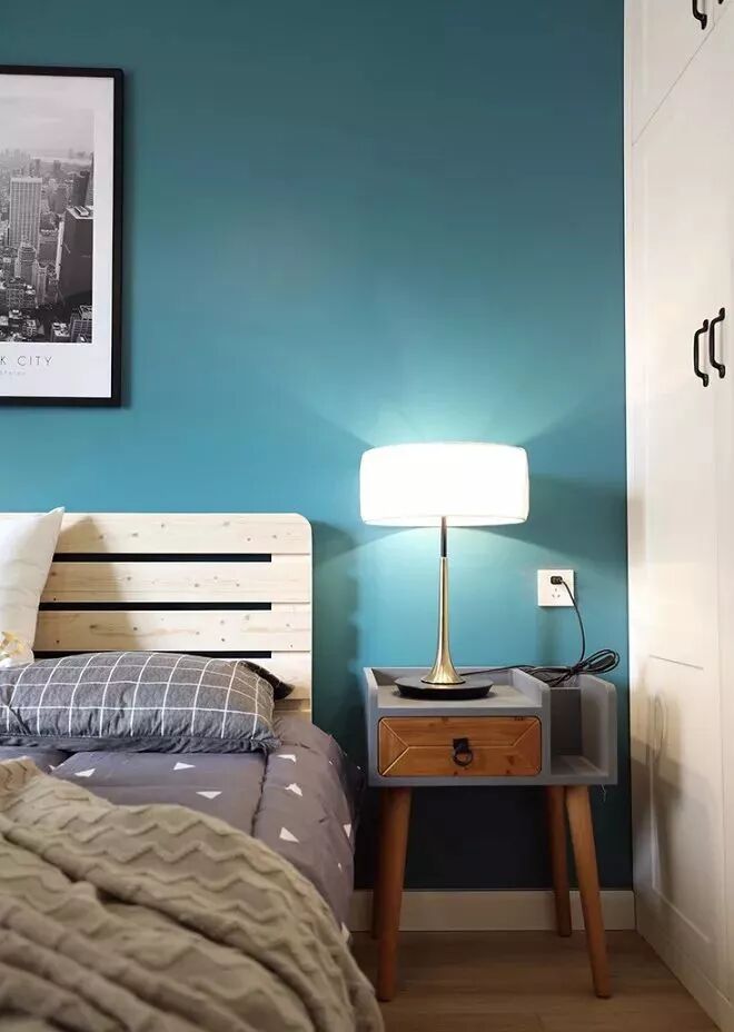 孔雀绿的床头背景给了空间新的生命和活力,改善了空间狭长的视觉感受。