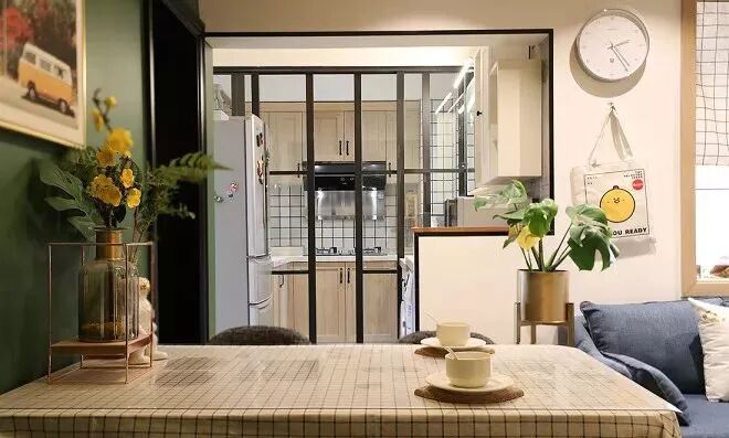 小户型设计的关键就是将空间物尽其用。比如卫生间的门,不仅仅只是门,也是一面全身镜,还能放射厨房透来的光,增加餐厅部分的光感。