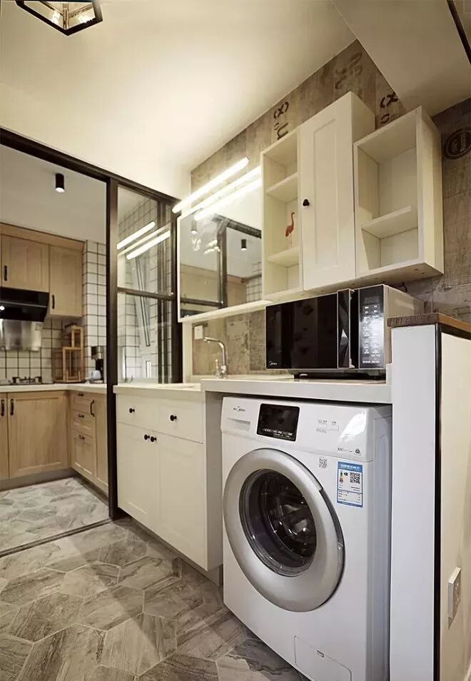 将客厅餐厅合二为一,原本的餐厅位置放置冰箱,洗衣机和洗手台,这样同时解放了厨房和卫生间的空间,可以满足洗手盘和马桶淋浴的同时使用,最大化的利用了原本的餐厅区域。