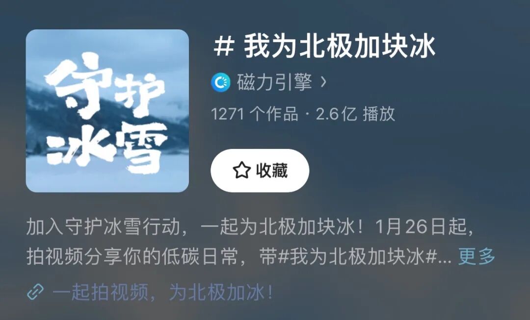 为呼吁用户和品牌重视日益严峻的气候挑战,磁力引擎与快手公益联合新华网、中华环保联合会、安踏等机构和品牌,共同发起“我为北极加块冰”守护冰雪公益行动,号召全社会及品牌积极应对极地冰川融化问题,以实际行动响应碳中和发展政策。