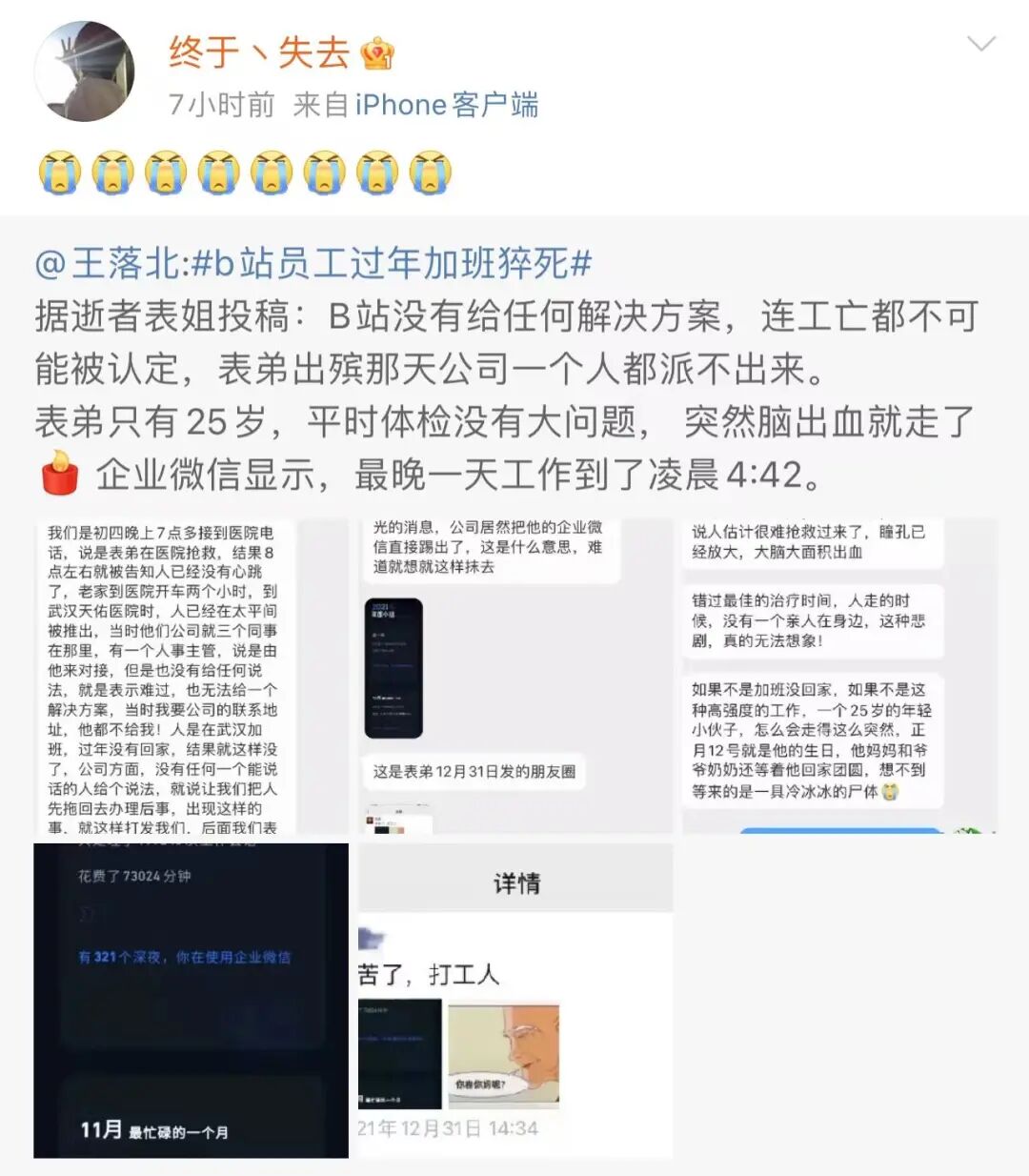 2月7日,新年后开工第一天,B站97年员工被曝加班猝死,微博博主@王落北 在微博上发文称:据多名网友爆料,B站武汉AI审核组组长因过年期间被要求加班,在晚上9点到早上9点的工作强度下,初五凌晨脑出血猝死,而公司光速把此事压了下来,现在企业微信上已查无此人。该博主微博上还称,逝者为代班组长,即拿一线的钱干组长的活。