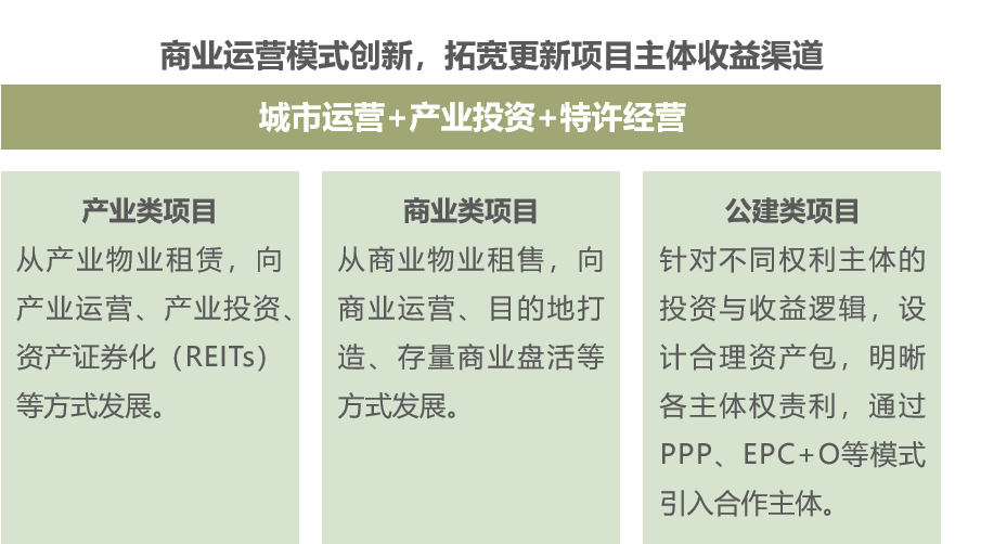 有机更新的核心是业态功能的更新。更新区域根据城市发展的需要(城市规划)确定新的功能定位,导入产业,增加所需要的公共管理、教育、医疗、商业、文旅、康养等相关功能。