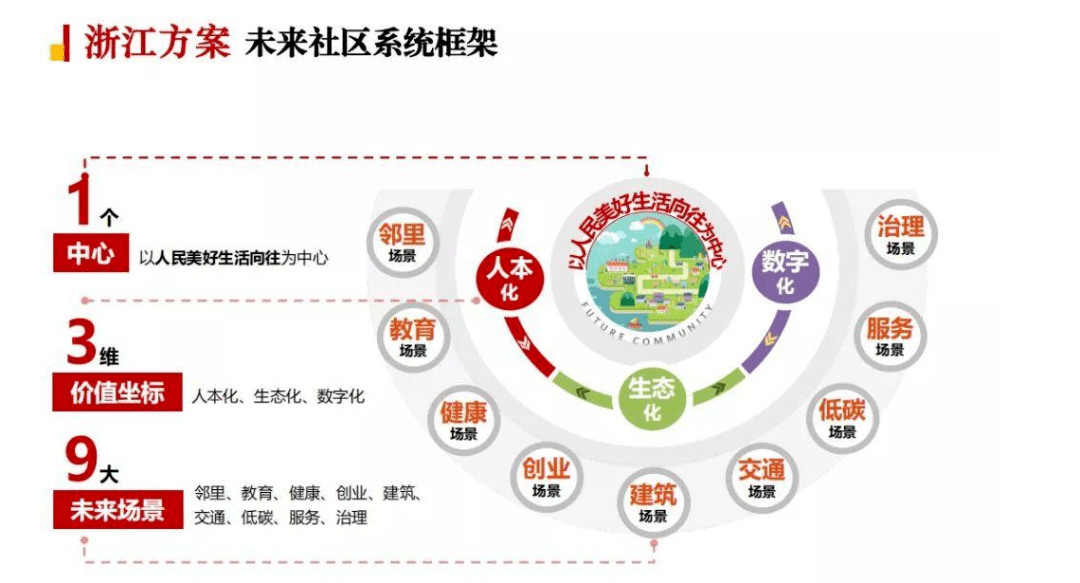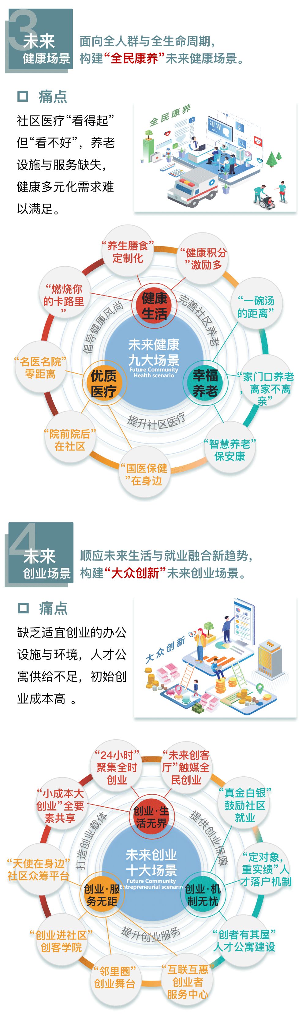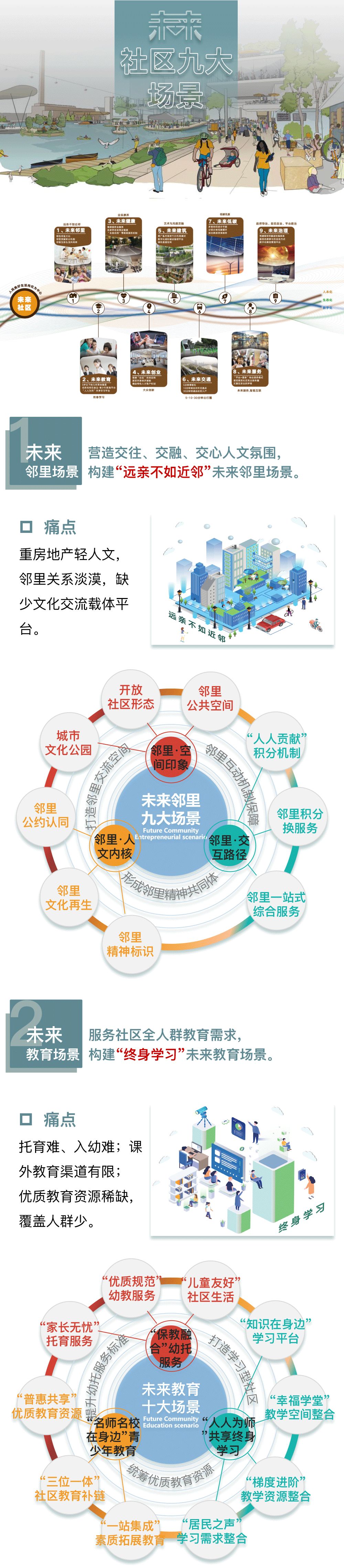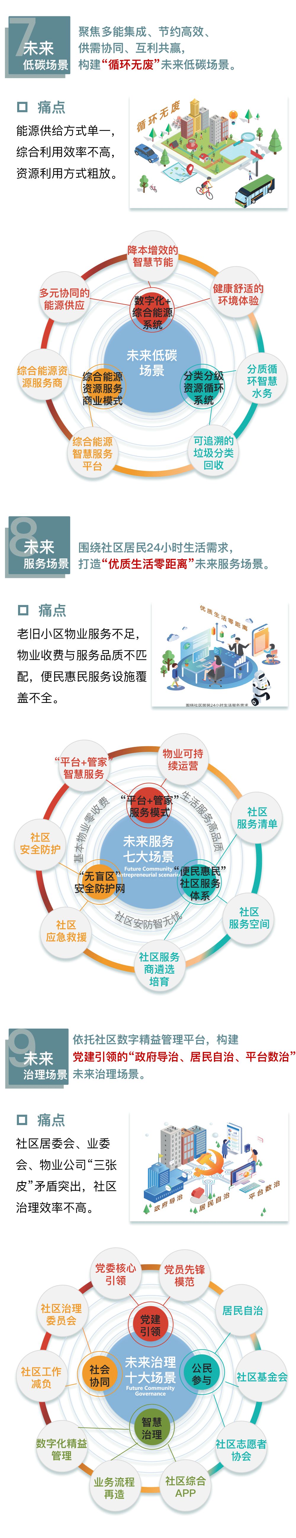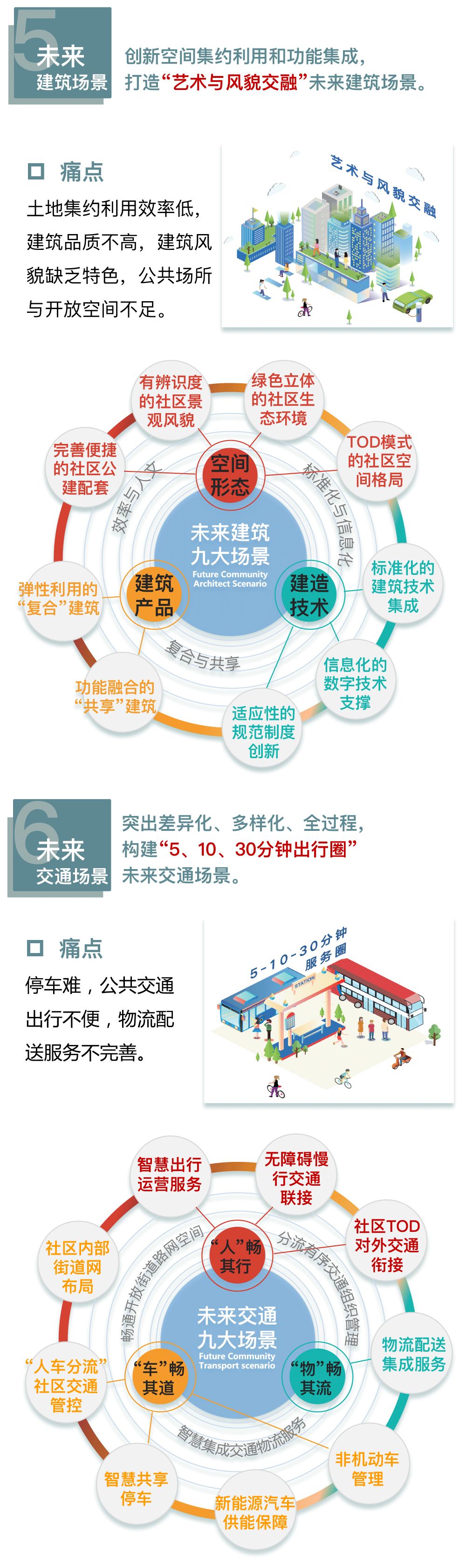 例如,未来邻里指标要求配置不小于600平方米的社区礼堂;未来教育指标要求配置不小于1000平方米的功能复合型社区幸福学堂,满足多龄段需求;未来健康指标要求15分钟步行圈内配置健身场馆、球类场地等场所设施,5分钟步行圈配置室内、室外健身点并且慢跑绿道应当成网成环;未来创业指标要求配建不小于300平方米的社区双创空间;未来建筑场景要求落实TOD导向(以公共交通为导向,Transit Oriented Development,“TOD”),实现开发强度梯级分布、空间功能复合利用、地上地下综合开发;未来低碳场景要求建设“光伏建筑一体化+储能”的供电系统;未来服务场景要求引入优质生活服务供应商,发展社区商业O2O模式。